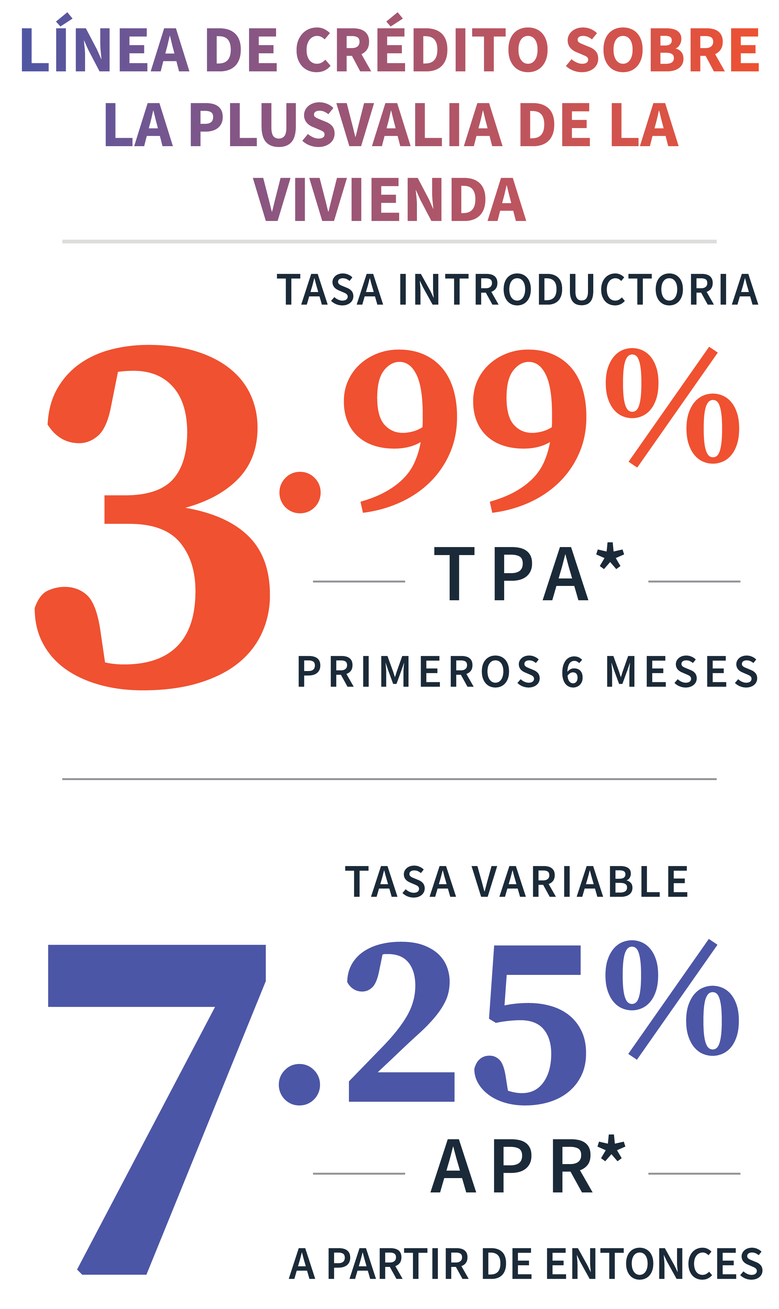 | Línea de crédito sobre el valor acumulado en la propiedad | Variable | Mayor de $100 o 1.50% del saldo | SOLICITUD DE PRÉSTAMO SOBRE EL VALOR ACUMULADO EN LA PROPIEDAD | |